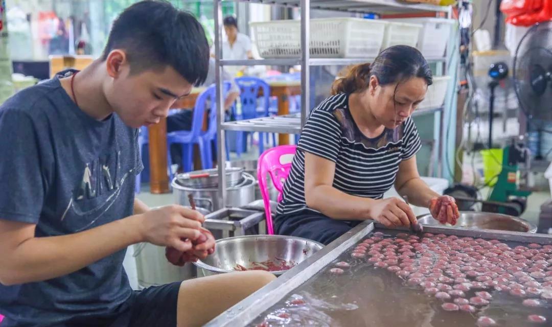 手工鲩丸都是家制自用,是作为当地客家人庆贺传统佳节和婚嫁寿诞时,宴请亲朋好友的一道传统大菜。打鱼丸主要选料要好,鱼要选草鲩,而且要生长在水质好的鱼,打出的鱼丸才靓。