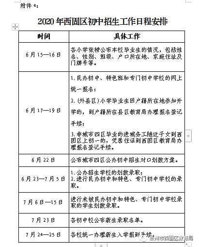 4.各招生单位要严格执行招生计划和对口划拨方案,在规定时间内完成初中招生工作。未经教育行政部门批准,任何学校不得提前组织招生。兰州市城市四区的小学毕业生不允许跨区流动入学。