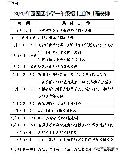 1.招生时间:全区小学招生统一报名时间为7月1--7月20日。各小学要从6月上旬开始,在校门口公示网上注册报名方式、报名程序、报名时间、招生条件、招生片区、准备资料、咨询电话等信息。各小学要设置专门办事窗口,宣传、解释招生政策,接待群众来访,确保本校服务片区内的所有适龄儿童接受义务教育。