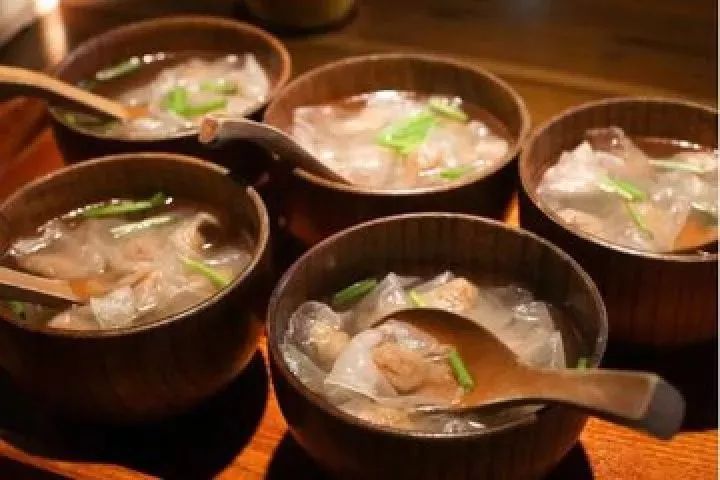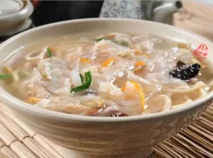 温州民间传统佳肴,相传已有百余年历史。直到今日,每到逢年过节、亲朋相聚,常以敲鱼款待客人。恰如其分的材料配比,厚薄均匀、薄如蝉翼才是这道菜的魅力。用鸡脯、火腿、香菇“三丝”加高汤、敲鱼烹制而成的“三丝敲鱼”是瓯菜中著名菜品之一,汤清味醇、鲜嫩爽滑,色泽调和,薄如蝉翼的敲鱼片呈半透明状,入口的弹牙感让人回味无穷。