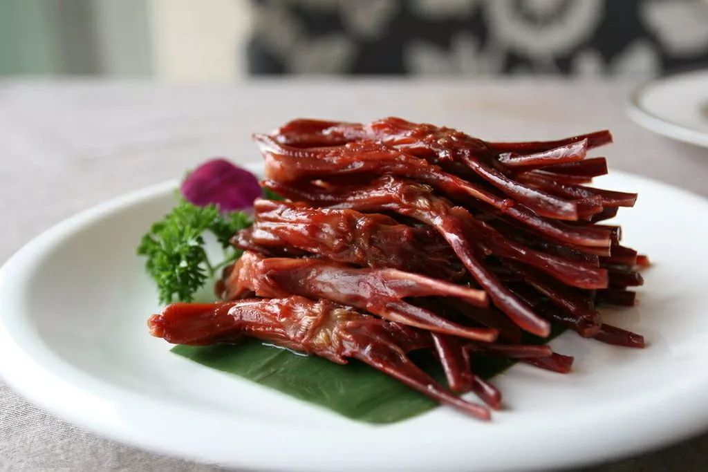 鸭舌是温州传统特产,可作为宴席中的冷菜,亦可作为小吃零食。一般将新鲜鸭舌添加调料经过卤、蒸等工序精致而成。精心卤制后的鸭舌,风至半干,入口细嚼,略带韧性,满口留香。