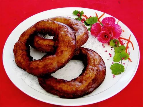 通渭荞圈圈以开水烫荞麦面,拌小苏打,调成糊状,旋入特制的木勺,再浸入沸油锅炸制而成。其形如镯环,色如蟹肉,味带天然之香甜,清香可口,让人垂涎,咀嚼时别有风味。