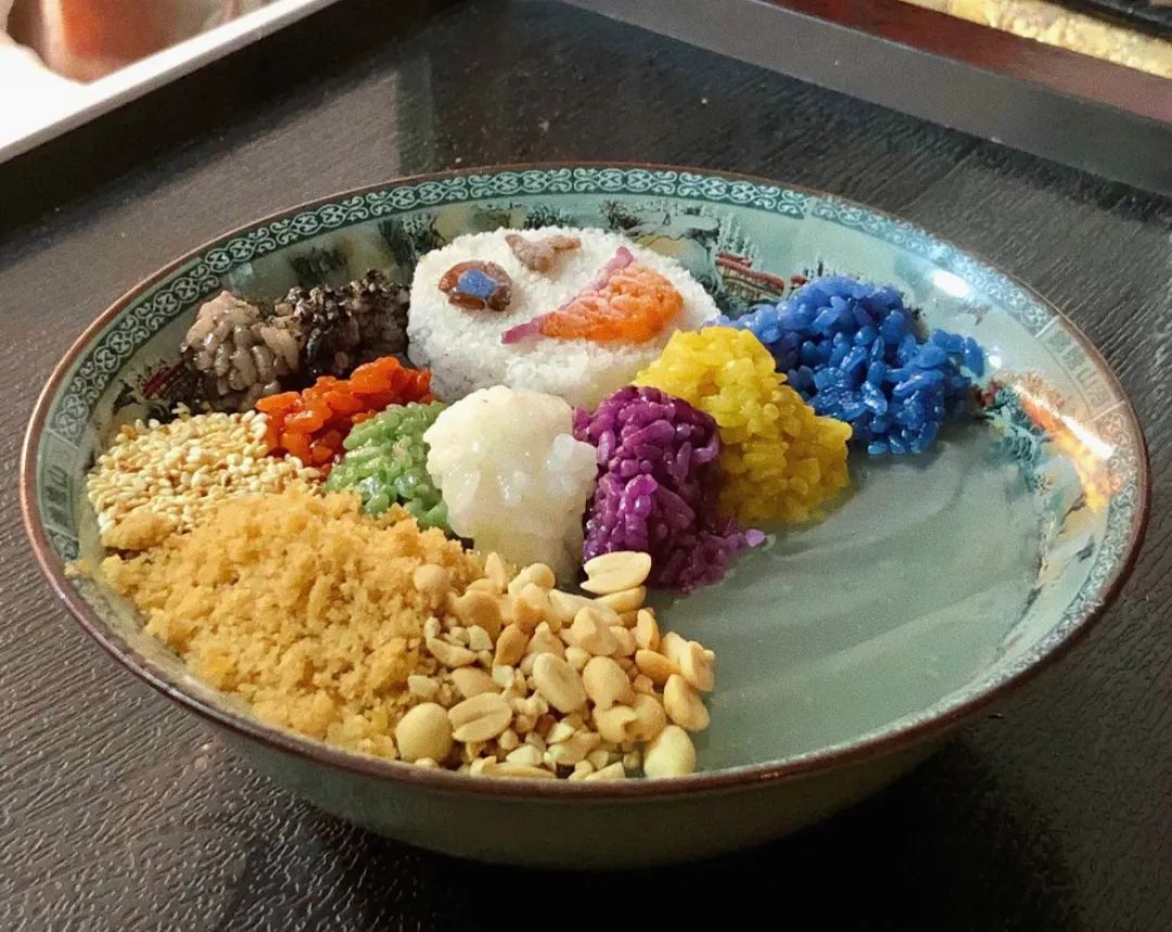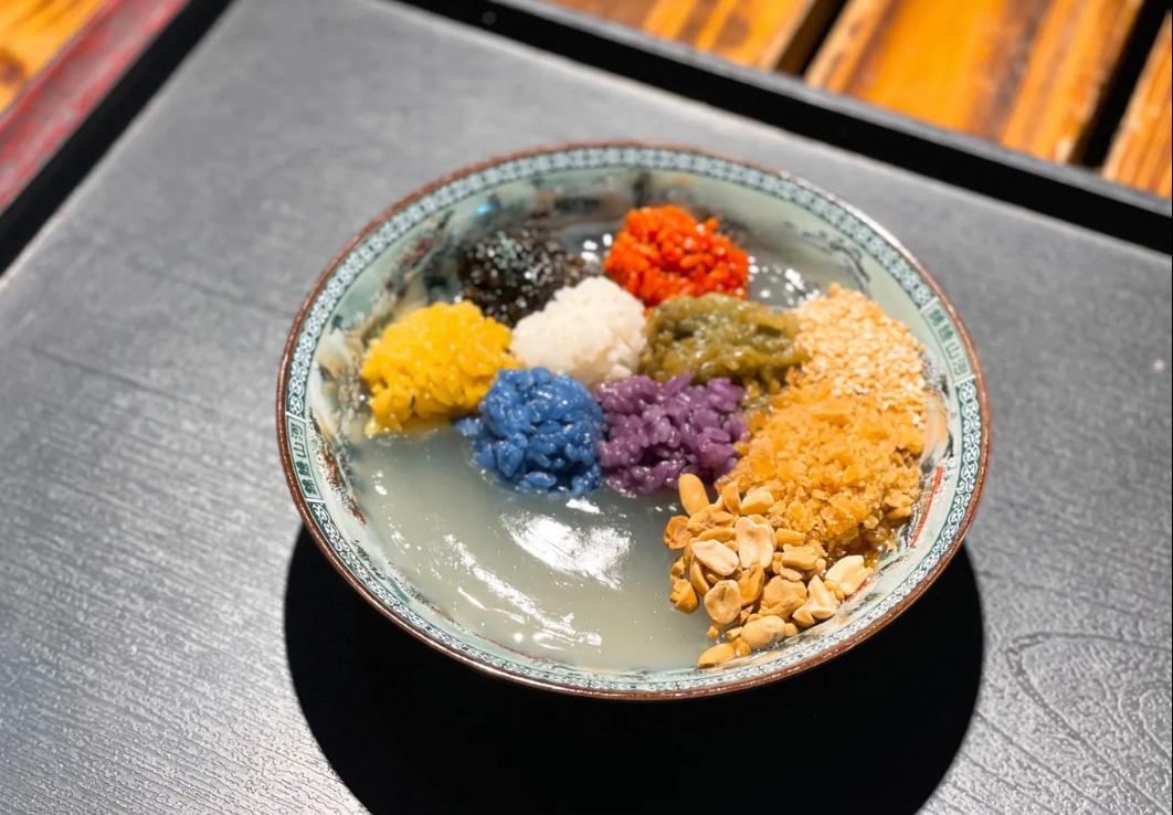 特别是中间的糯米蒸糕,配着五彩米浆,一勺一勺挖着吃,简直是必爱小甜品系列!喜欢吃甜食的瞧友们赶紧把这件列入打卡清单吧!