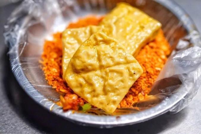 盒子粑的米浆要用本地米、香米以及安龙米,搭配鸡蛋和黄豆一起调制而成。盒子外壳酥脆,内馅又软又糯,再浇上辣椒水,吃完更是满口留香。