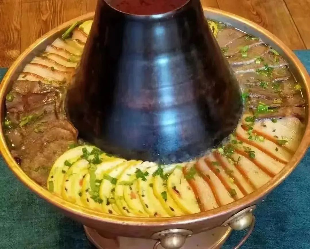 传统小吃炕锅子是一种街边小吃,主料是猪羊的各种内脏,洗净小煮,切成片,热锅热油,下锅炕得油滋焦香,配有洋葱、青椒、洋芋、蒜苗及花椒等各种佐料,将铁制的平底锅搁到熊熊燃烧的炉火上,伴随着嗞嗞啦啦的烤制声,香气四溢的地道美食便就此诞生。吃一上口便有一股舒胃的香,诱脾的香,穿舌的香,透骨的香。