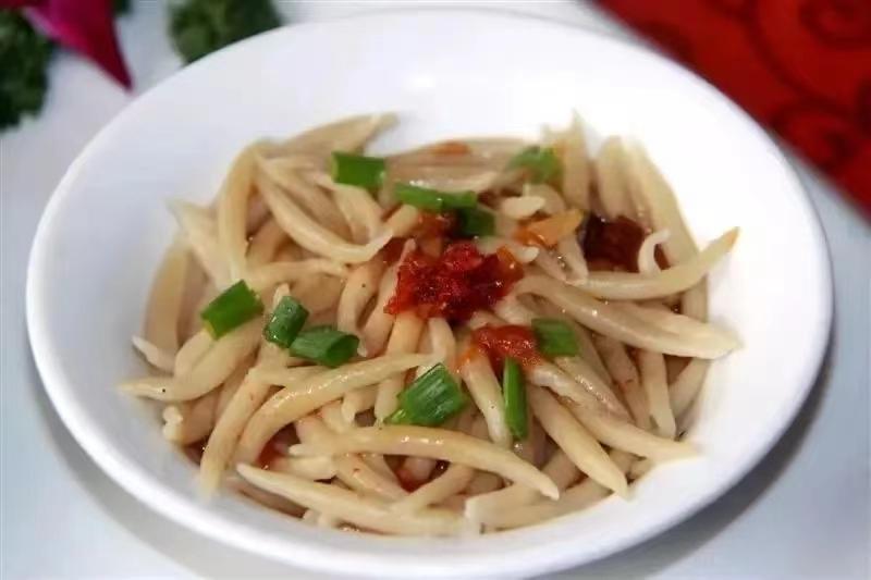 永昌搓鱼子,搭配时令蔬菜,既可以干拌来吃,也可以和汤一起,口感滑软又不失韧性。面皮子色泽晶莹黄亮,透明如玉,切成长条状或块状,根据需要配以醋汁、蒜泥、辣椒酱、黄瓜、胡萝卜丝等调味品即成,口感清凉酸辣。