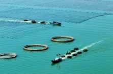 4月15日,在山东省荣成市石岛管理区桑沟湾海域一处码头,渔民等待乘船出海开展养殖作业(无人机照片)。4月15日,在山东省荣成市石岛管理区桑沟湾海域网箱养殖区,渔民开展养殖作业(无人机照片)。