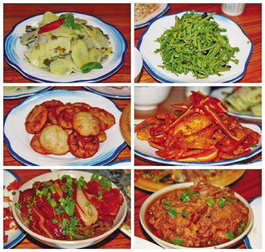 【热菜】 清蒸中华鲟、农家蒸碗(肥、瘦各一碗)、锅盔耳片、土豆粉饼腊肉、农家百味、农家炖豆腐、田园青炒、瘦骨荟萃。