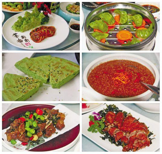 【小吃】 绿茶饼、龙井锅盔、翠芽蛋糕、绿茶蒸饺。