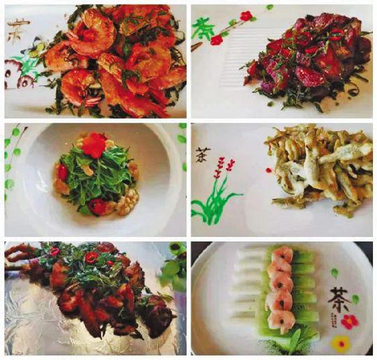 【凉菜】 乌龙猪耳、绿茶凉粉、茶香山药、龙井鸡丝、观音月牙骨、金丝翠芽桃仁、茶香杏鲍菇。