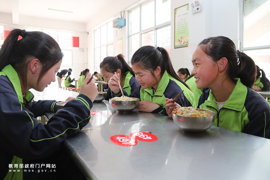 新安县产业集聚区实验学校学生餐厅,同学们按号就座正在吃午饭。(张劲松/摄 李丹/文)