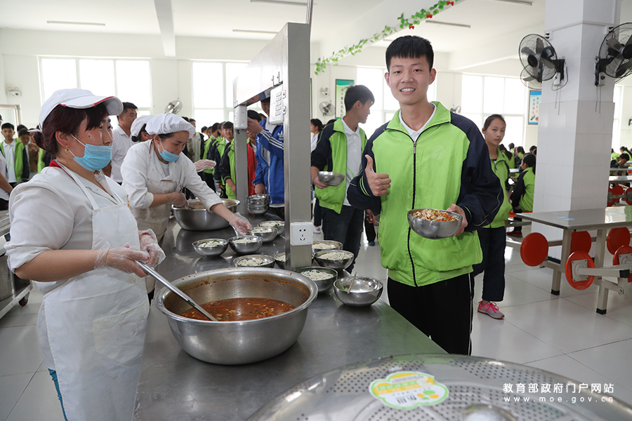 提及学校的用餐环境和饭菜质量,一名同学竖起了大拇指。(张劲松/摄 李丹/文)