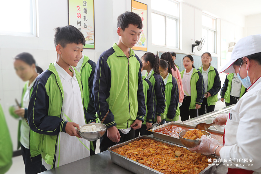 新安县产业集聚区实验学校学生餐厅二楼,同学们正在排队打饭。(张劲松/摄 李丹/文)