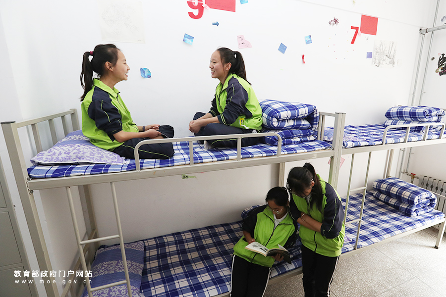 新安县产业集聚区实验学校女生宿舍,放学后同学们在宿舍内谈心、看书。新安县产业集聚区实验学校位于城乡结合部,是一所九年一贯制寄宿学校。学校实行学生自治和生活老师监管相结合的就餐就寝管理模式。为贯彻落实党的十九大精神,聚焦教育系统长期以来的热点难点问题,5月10日,由教育部新闻办组织的教育奋进之笔“1+1”系列发布采访活动走进河南,深入了解乡村小规模学校和乡镇寄宿制学校建设情况。(张劲松/摄 李丹/文)