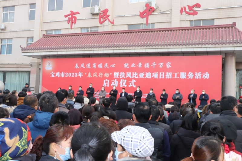 春风带岗送温暖,就业幸福千万家!1月12日,宝鸡市2023年“春风行动”暨扶风比亚迪项目招工服务活动启动仪式在扶风县市民中心广场举行,在全省率先启动了开年首场大型就业活动,拉开了宝鸡市“春风行动”活动序幕。活动开启后,全市人社部门积极响应、迅速行动,抢抓春节前后企业用工和劳动力资源供需高峰的有利时机,坚持将春风行动招聘与重点项目用工、春暖农民工服务相结合,采取直播带岗、专场招聘、“点对点”输送、“一对一”帮扶等方式,帮助群众就业,支持企业用工。