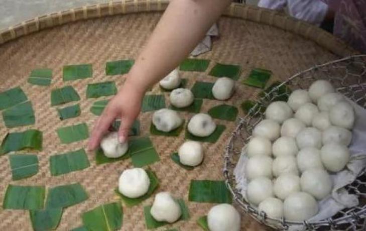 早先的崇明圆子做好后,都放在锅内用水煮熟。那铁锅内的水刚刚烧开时,就把已做就的圆子倒入,待水烧至滚滚翻动时,那一个个熟透的圆子便氽起在上面。人们把这一过程叫“下圆子”。它们捞起来后,晾在洁净的灶面上,待一会再贴上芦青叶片,或者竹笋的笋壳叶片。这样的圆子,表面光亮细滑,很是惹人喜爱。而现在,岛上店家的圆子,都是放在蒸格上蒸熟的,岛人称之为烀圆子。由于底部的叶片是未熟时先贴上去的,品尝时比较难剝。