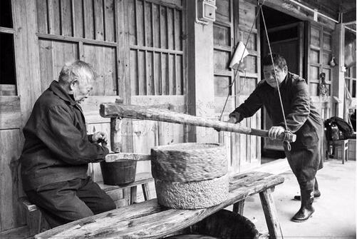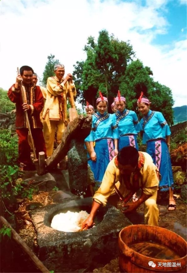 打饭糍是畲族的一种习俗。畲族的许多节日都要打饭糍的。先将泡好的糯米经过木甑子蒸熟后,放到一个石槽里,用石臼反复捶打。