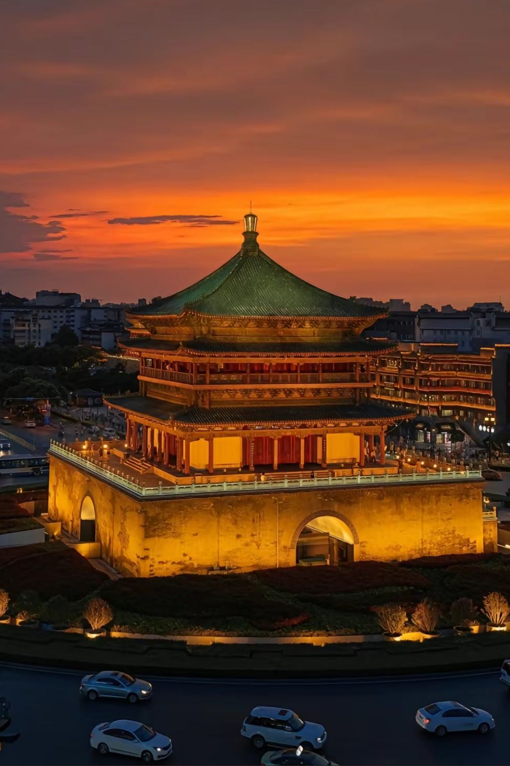 2. 钟楼——建筑于明代时期的钟楼,矗立于陕西省西安市区的核心位置,它是国内保存最为完好的钟楼之一。登上钟楼,你能看到绯红如霞的天空下,古城西安的繁华景象尽收眼底。夜幕降临后,钟楼上的灯火熠熠夺目,在光辉中,古城的韵味更加浓郁。