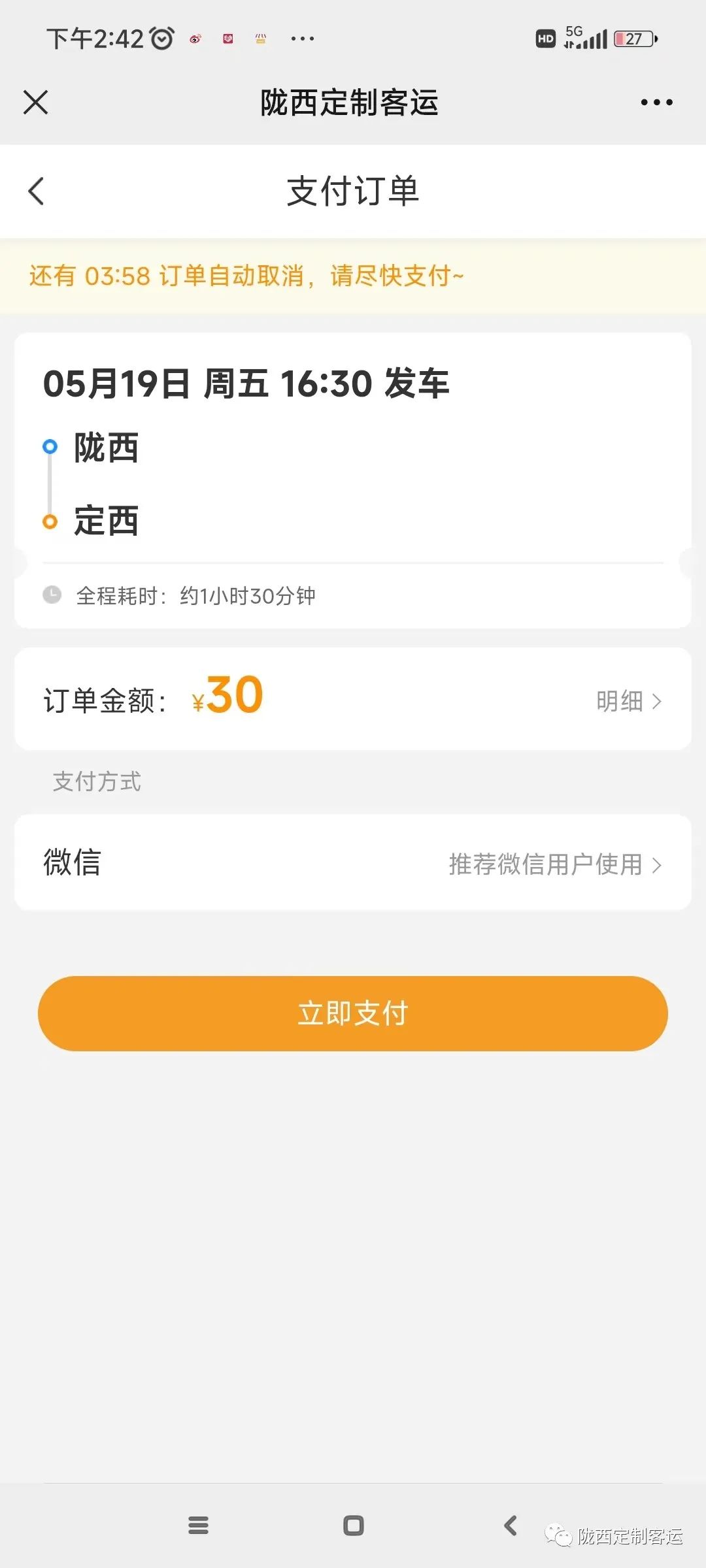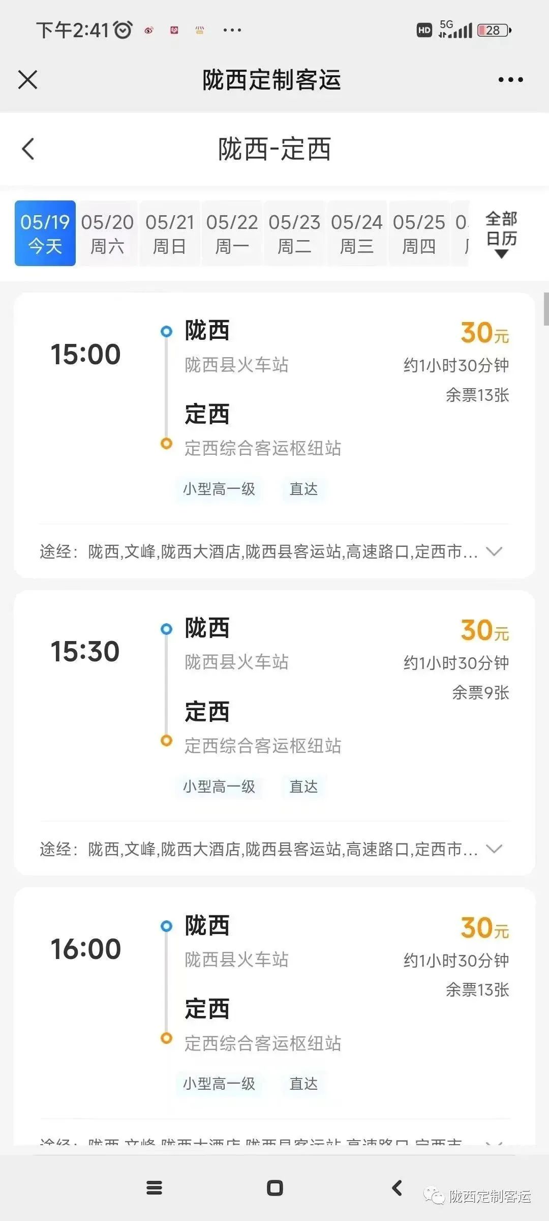 一、微信搜索陇西定制客运公众号或扫描二维码,根据出行需求选择线路(在陇西定制客运首页直接输入出发地、到达地)选择出行日期和班次。