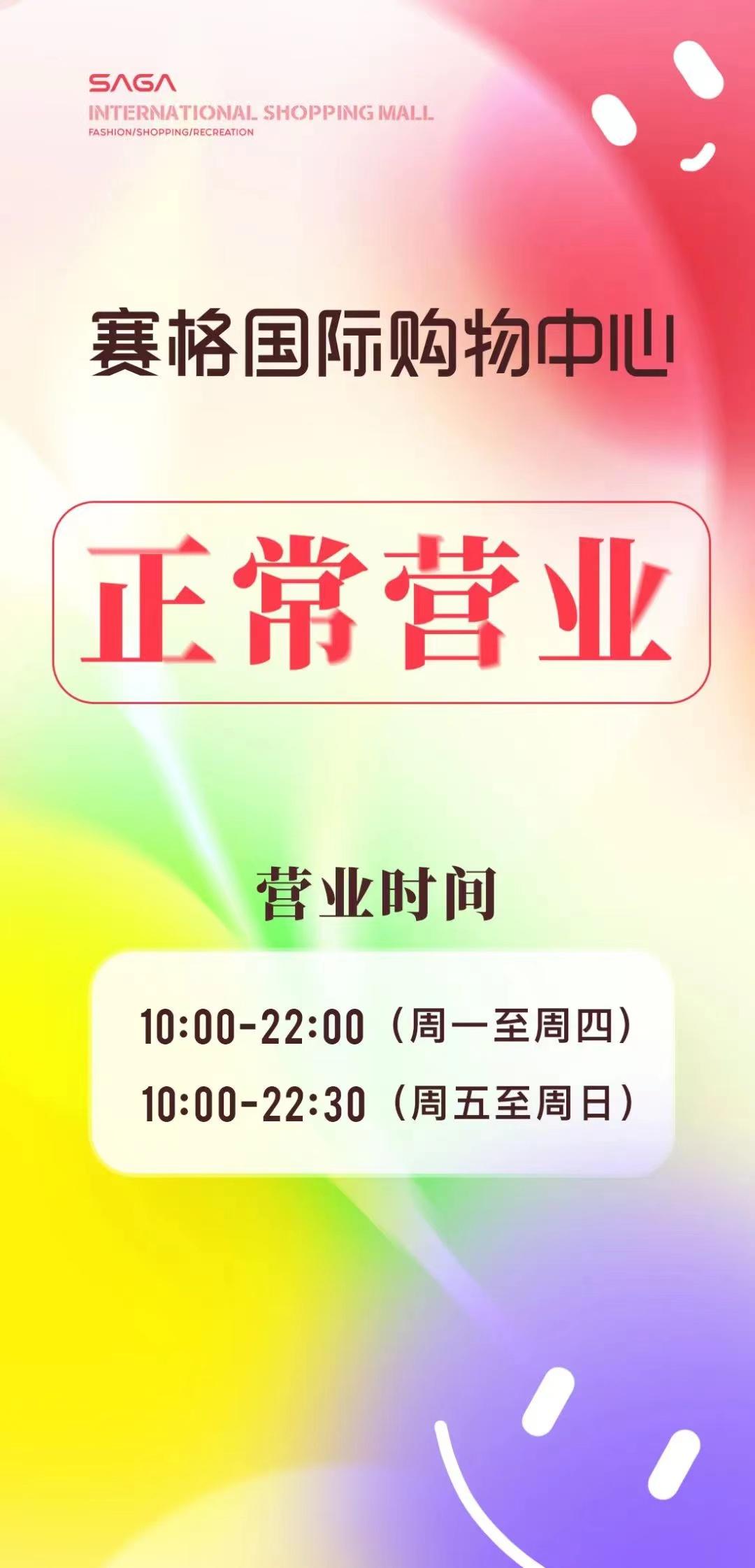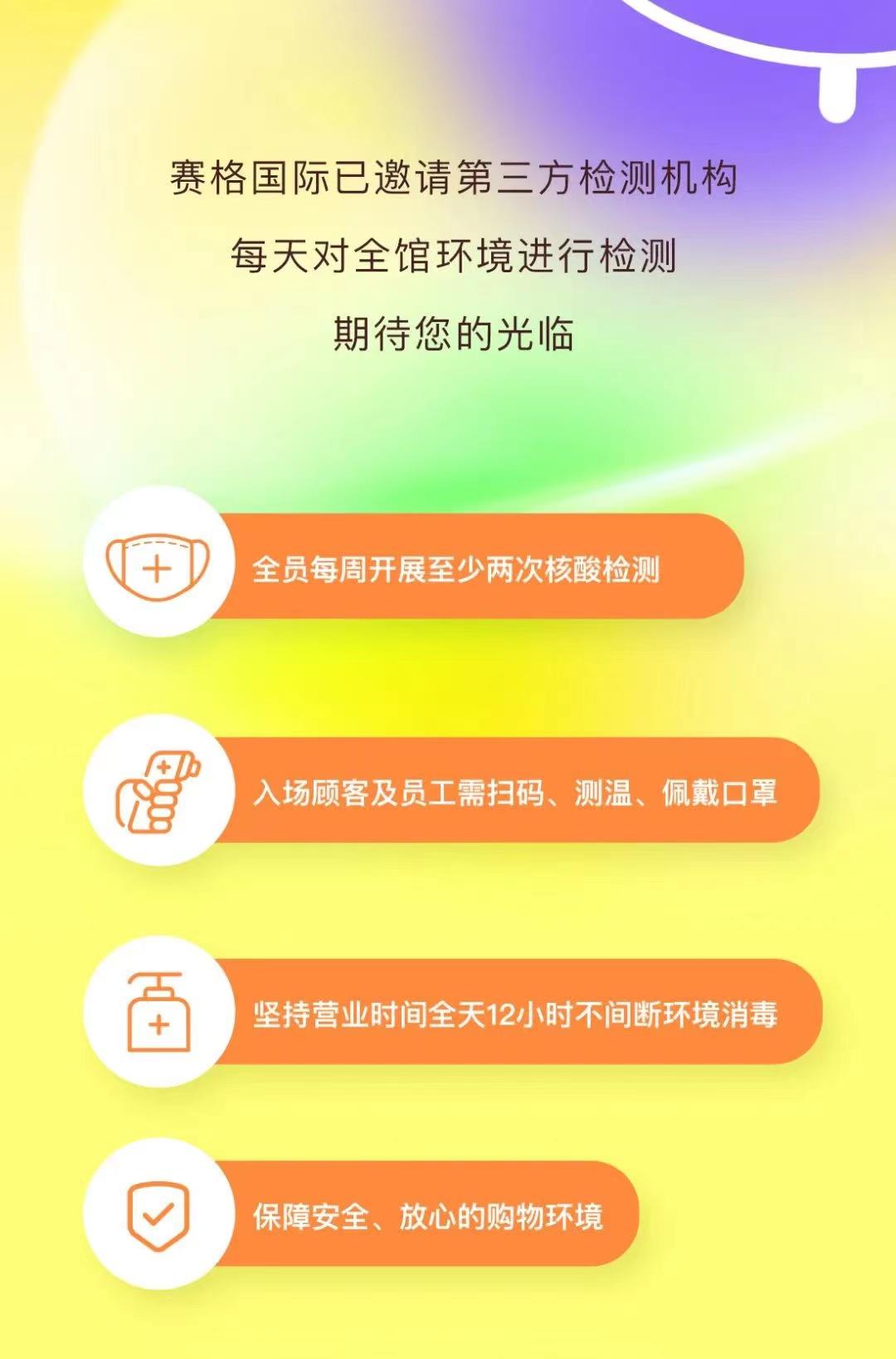 记者从赛格国际微信公众号了解到,赛格国际购物中心今日(3月19日)恢复营业,周一至周四营业时间为10:00-22:00,周五至周日营业时间为10:00-22:30,另外,赛格国际购物中心将对全体员工每周开展至少两次核酸检测,具体通知如下: