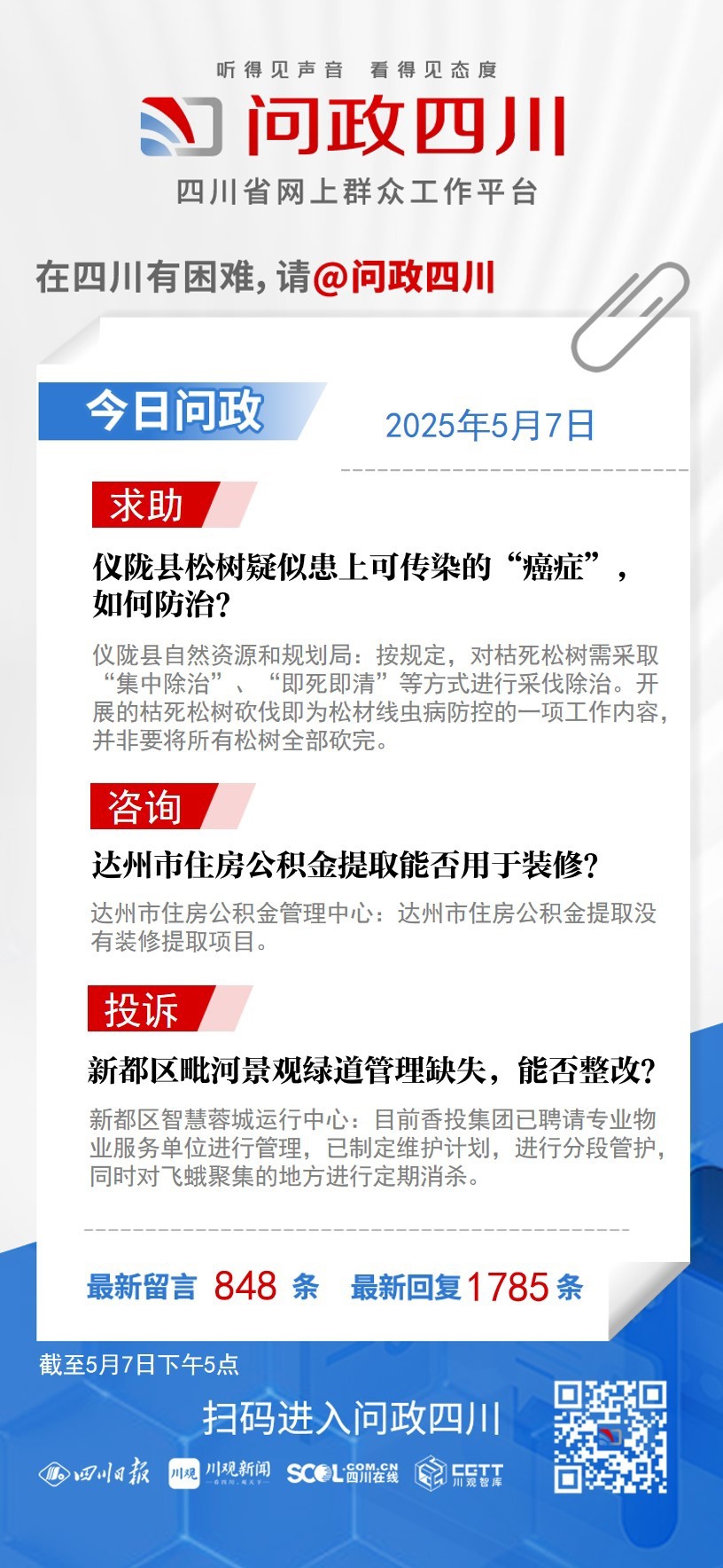在四川有困难,找问政四川。如果您在四川遇到了操心事、烦心事、揪心事,请登录“四川省网上群众工作平台—问政四川”或拨打问政四川热线(028-96001)留言反映、求助或建议。我们将充分发挥平台的互动联系作用及舆论监督功能,第一时间传递民声,推动问题得以及时解决——听得见声音,看得见态度。