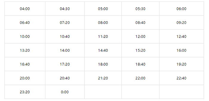 ★发车间隔:04:00—06:00:30分钟/班,06:00—次日00:00:40分钟/班,客满即发