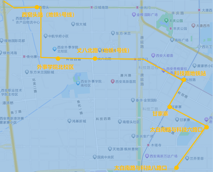 ★运行路线:西窑头站(地铁5号线)—外事学院北校区(科技西路与鱼化三路)—丈八北路(地铁3号线)—科技路地铁站—甘家寨—太白南路与科技六路口—太白南路与科技八路口