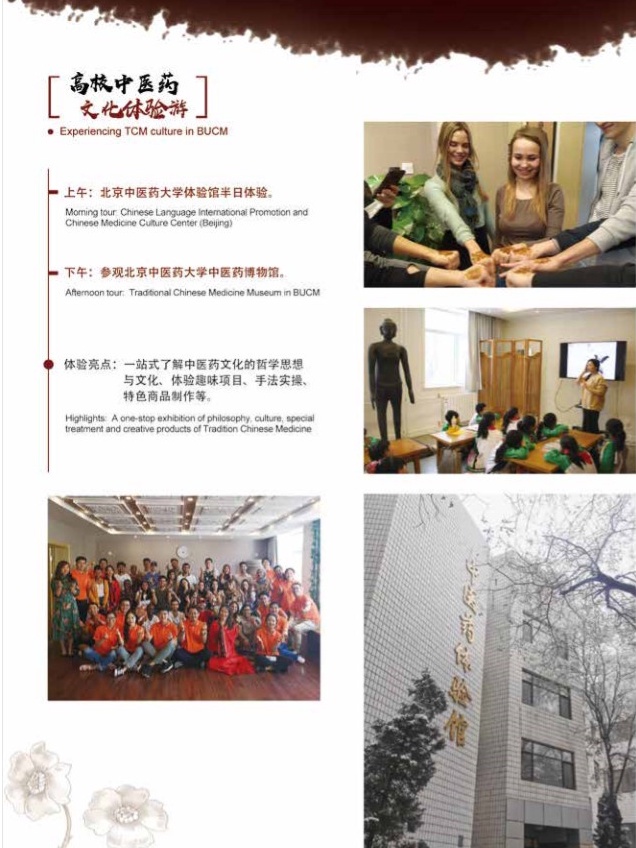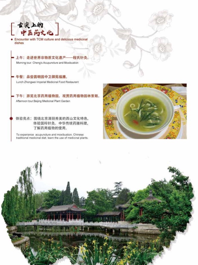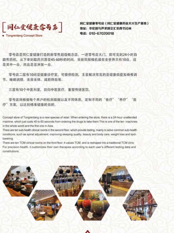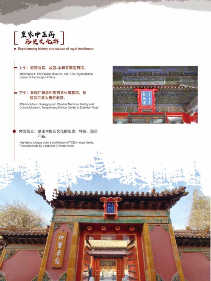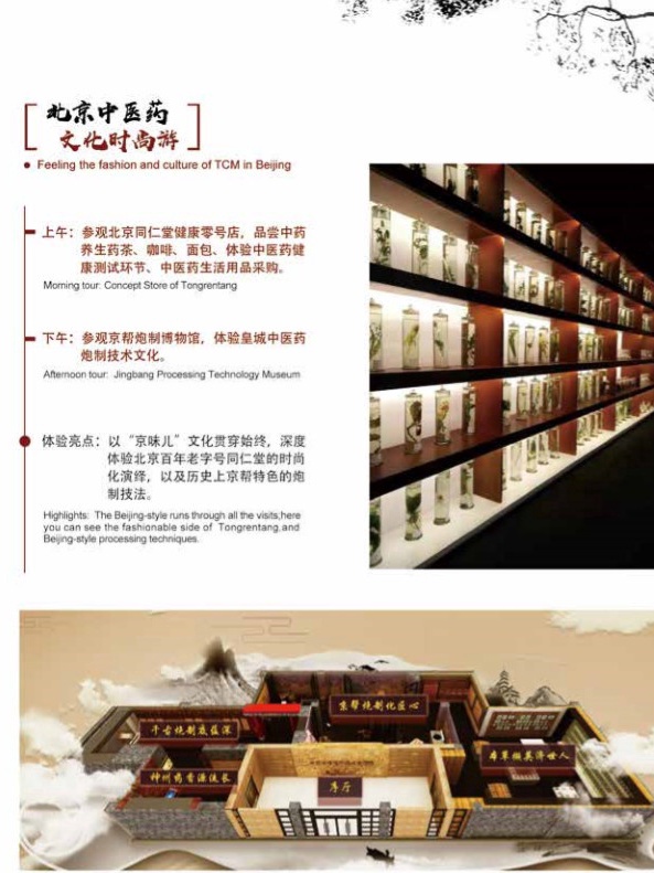 上午:参观北京同仁堂健康零号店、品尝中药养生药茶、咖啡、面包、体验中医药健康测试环节、中医药生活用品采购。