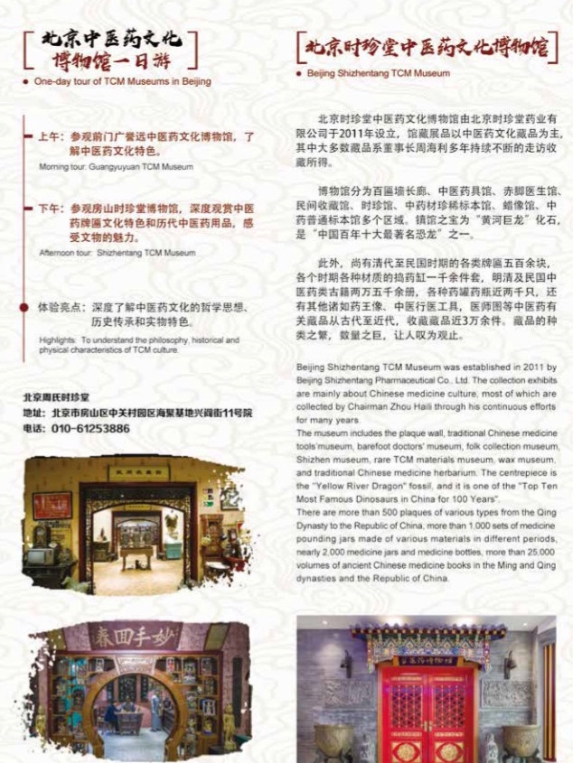 下午:参观房山时珍堂博物馆,深度观赏中医药牌匾文化特色和历代中医药用品,感受文物的魅力。