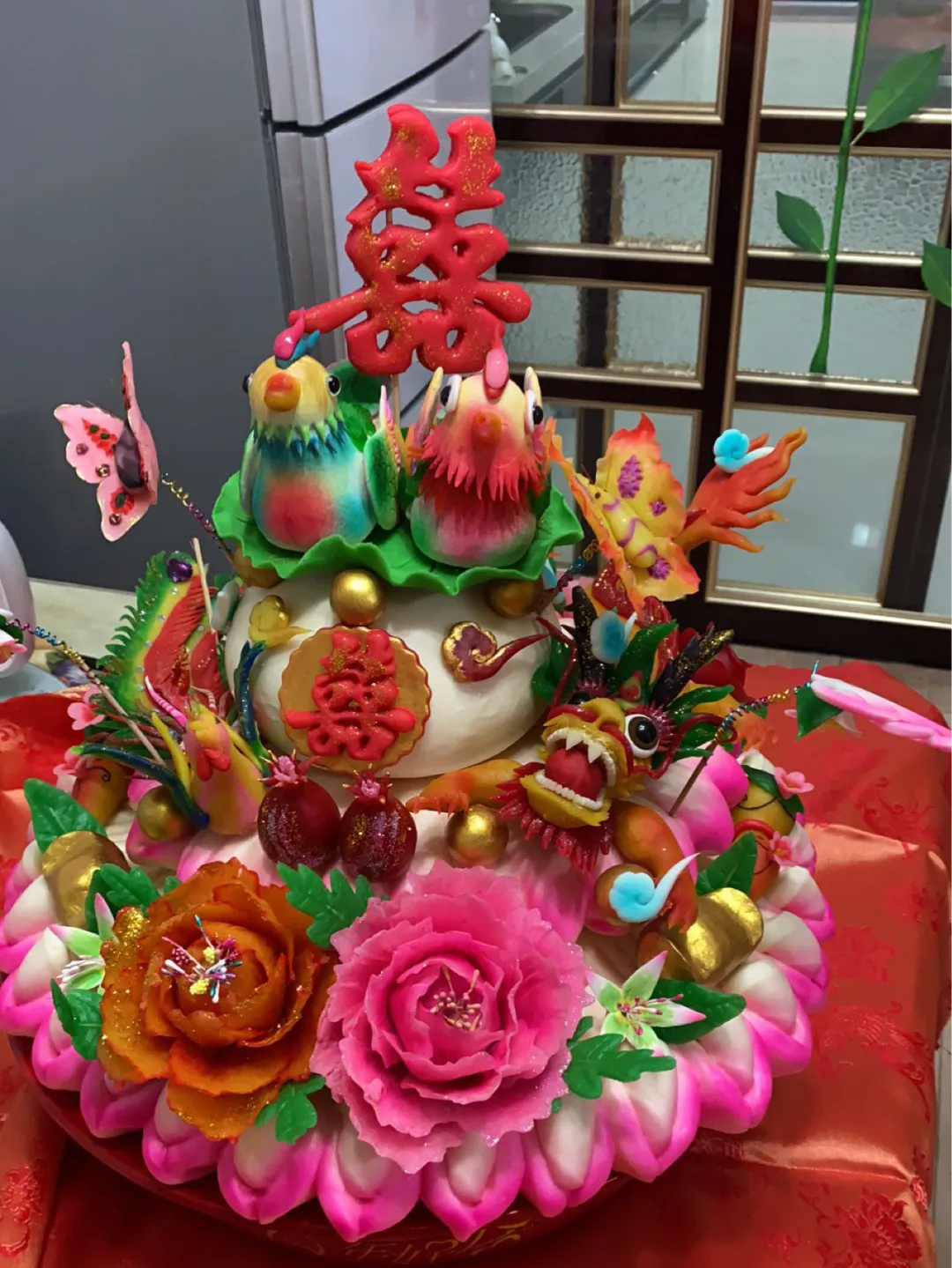 随着技艺的不断精湛,应用于不同场合的花饽饽应运而生,上面几种都是作为婚礼摆台的花饽饽,颜色和造型都非常喜庆,也十分应景。