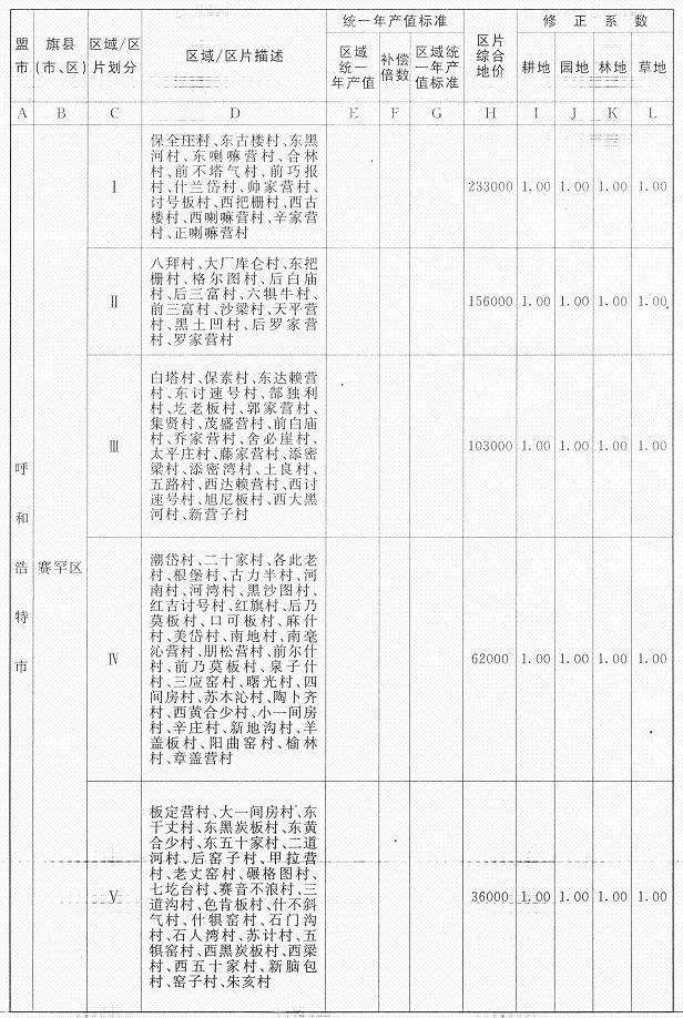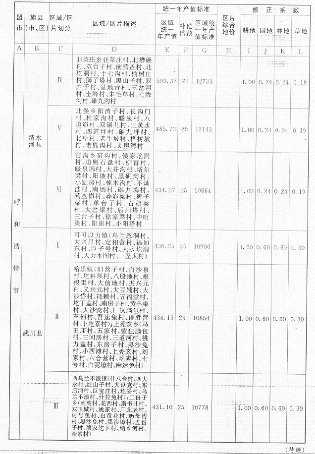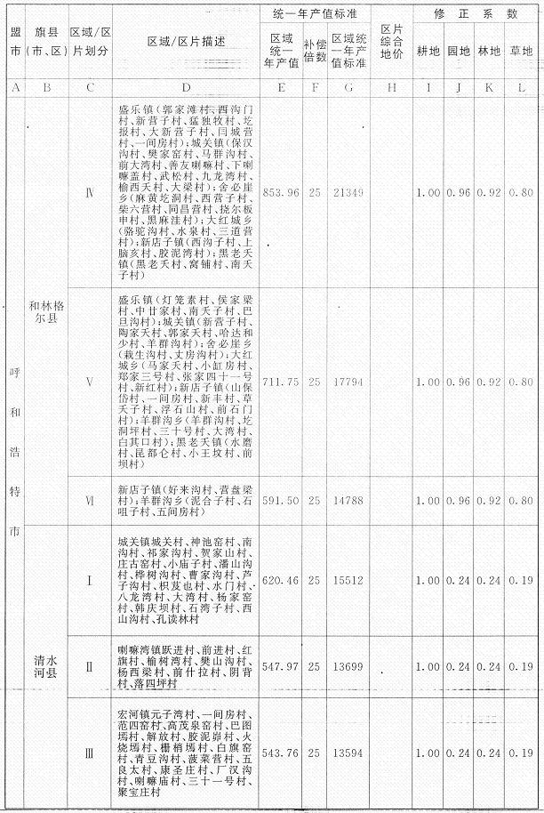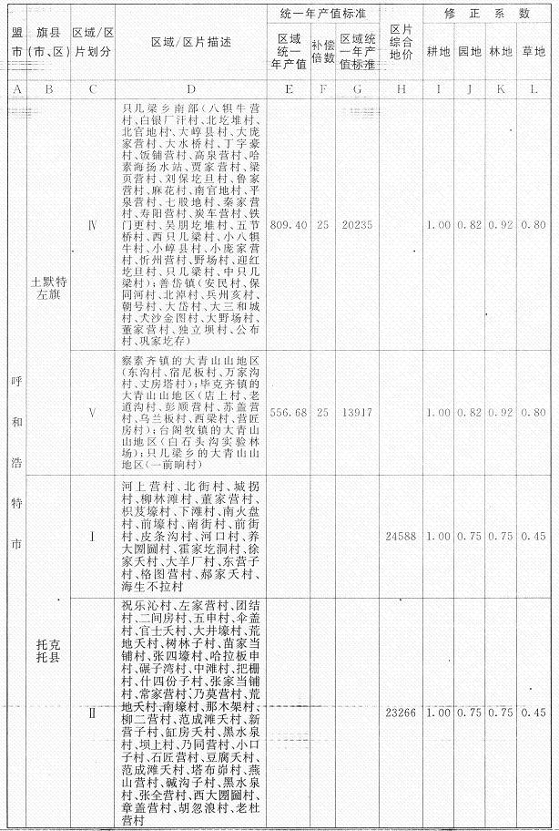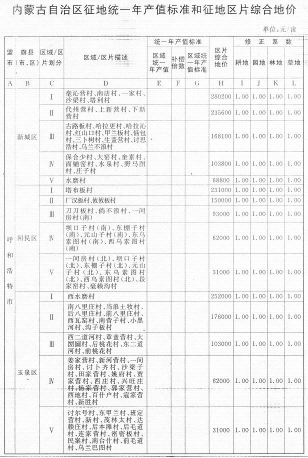 内蒙古自治区征地统一年产值标准和征地区片综合地价
