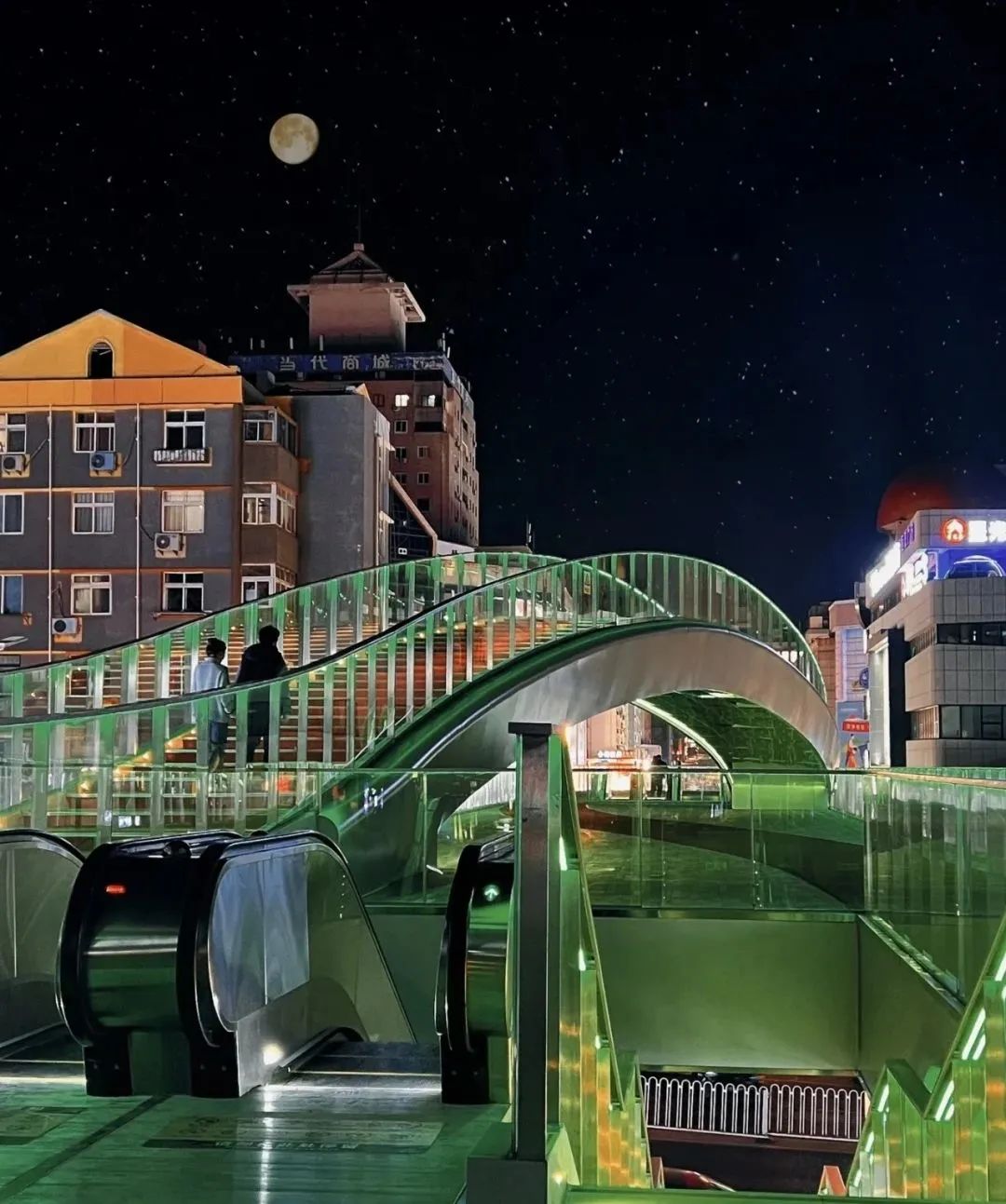 新的天桥分为上下两层,上面是拱桥,可以快速横穿威海路,下面是平段直桥,可以在此驻足观景,俯瞰整个台东商业街的全貌,看威海路的车水马龙。新天桥的整体造型非常现代化,设计感十足,拱桥与平段直桥二者共同形成一个八字形回环路径,是一座可以无限循环的漫步系统,夜晚还能亮起炫彩的灯光,站在桥上,看桥下滚滚车流,商业街璀璨繁华,别有一番风味。