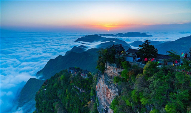 北山腰处,“云卧仙人床”的景致如梦如幻。因空气湿润,在冷热温差的作用下,绒布般的雾气升腾而起,瞬间凝聚,在高山岭梁间缥缈回荡。二梁子若隐若现,寺观掩映在密雾与烟岚深处。当云烟随风飞舞,仿佛真有仙人依床而卧、盘膝而坐。腾空如练的云朵,汇成层层白浪,飘悬于山腰,浮荡在麓谷,这便是“云海浮仙山”。细看之下,浩瀚云涛翻涌,数座苍翠峰峦若隐若现。旭日东升时,云蒸霞蔚,金光漫顶,整座高山宛如漂浮在海上,仙气萦绕。
