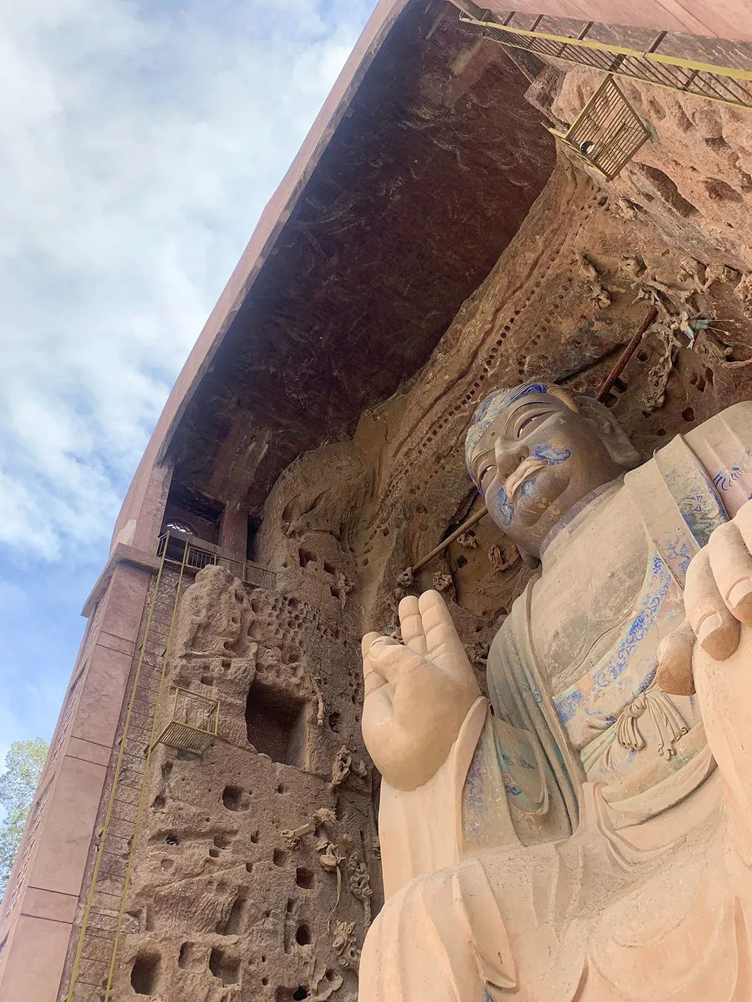 我在大像山大佛眼前住了八天期间,又观瞻一尊大佛——武山县水帘洞石窟大佛。鲁班峡谷的雲影,斑驳在武山大佛北周的题记辞颂中,旷古铺面而来。