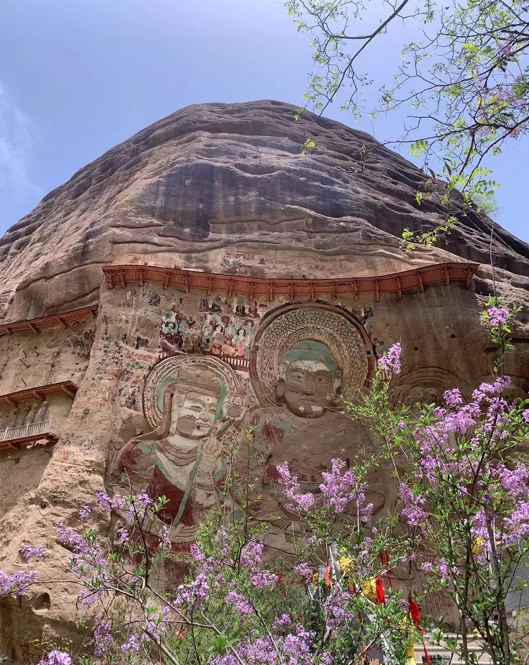 既往山色的雲,写满天空,莲花峰矗立眼前,同游者颉兄所言“拔地而起”。确实雄壮而又慈悲,丁香摇曳,云梯巍然,摩崖佛像带领群山,朝夏天挺进又一场风雨叠和交加时,避入崖壁华盖寺,洞窟里元明以来的壁画,在咸默中等待那些被城市遗忘的注视,举灯四目相对时,朱砂在框定的警觉里,修改着一抹偏激的石青色,古壁画墨迹未干,为谁预留的题记,留白着谁的夙愿。
