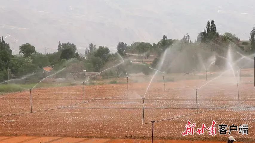 “这个是地面喷灌,每个位置都能喷到。”甘肃力速达农林科技信息有限公司技术负责人白腾荣介绍,引水上山工程在铺设管道时通过合理布局,保证每块地面都能喷洒到位。