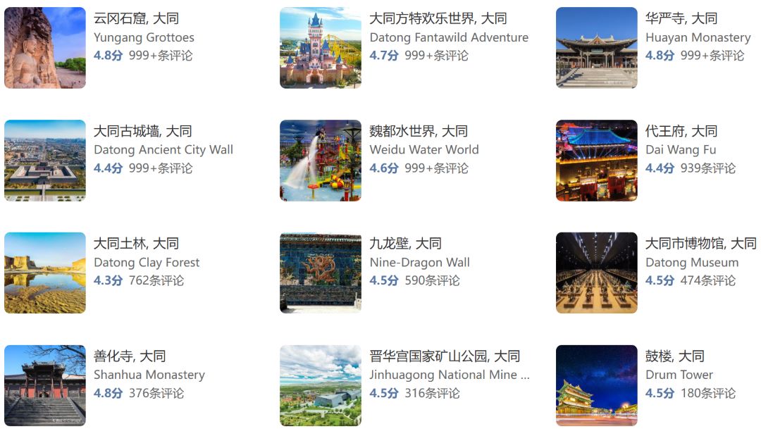 云冈石窟(1天)-华严寺+善化寺(半日)-古城墙+九龙壁(半日)-悬空寺+恒山(1天)
