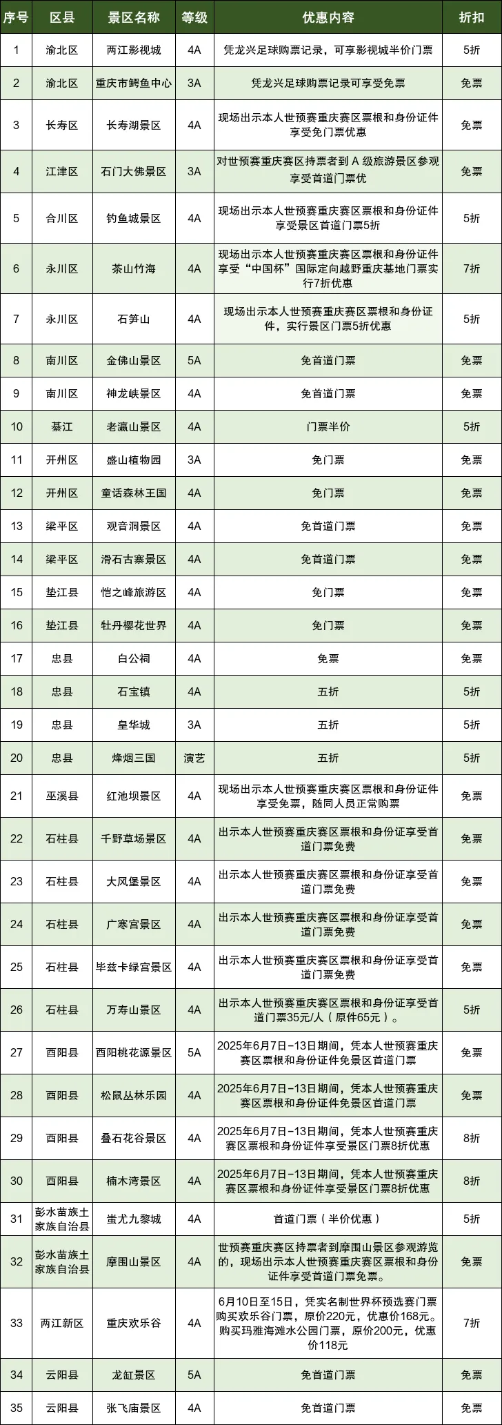 重庆不光赛事的各项组织工作已经准备好了,方便到时齐聚山城的各地球迷的专属文旅“福利”也已经准备好了!6月3日,来自重庆市文化和旅游发展委员会的消息,截至目前,全市各区县已有35家景区均已宣布面向所有来渝为国足加油助威的球迷发放门票减免优惠。
