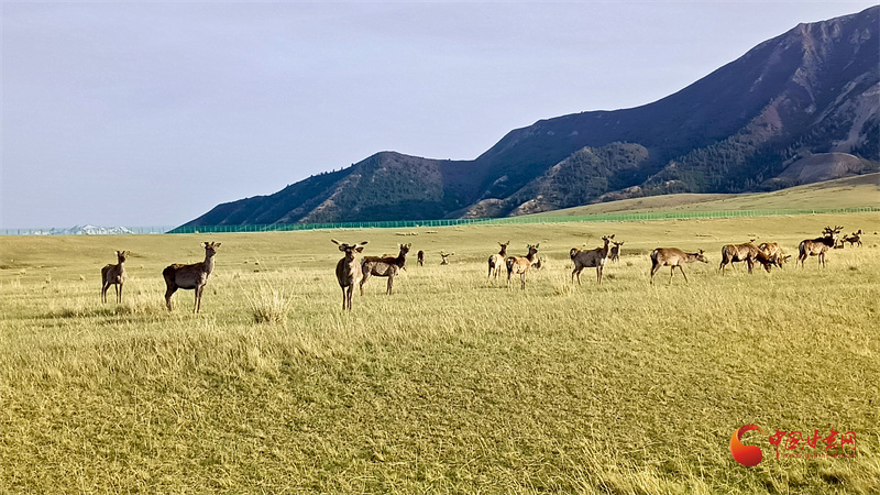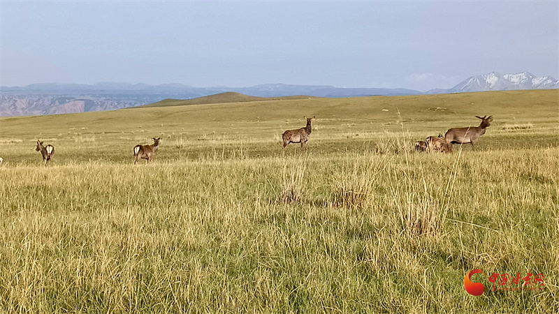 初夏的肃南大河草原牧草逐渐返青,一群群马鹿在草原上悠闲觅食,游客到来并没有打扰它们的正常活动。