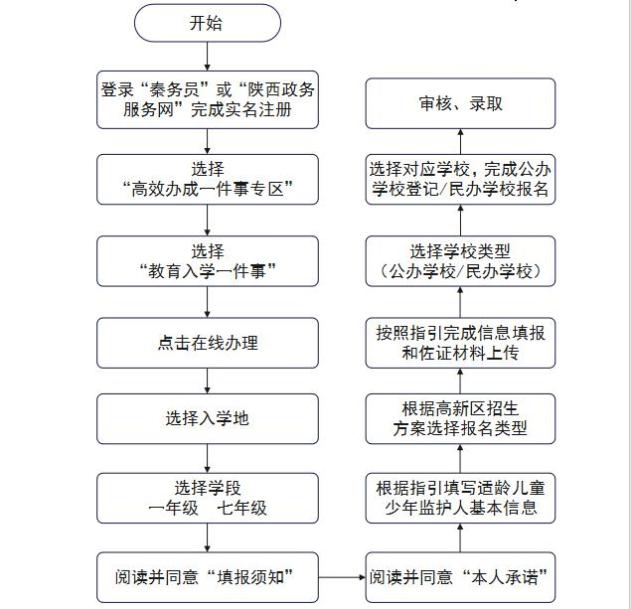 答:(1)了解网上办理入口。通过下载“秦务员”APP,或通过支付宝进入“秦务员”小程序,或登录“陕西政务服务网”,完成实名注册登录。选择“高效办成一件事专区”,选择“教育入学一件事”,根据指引进行网上办理。