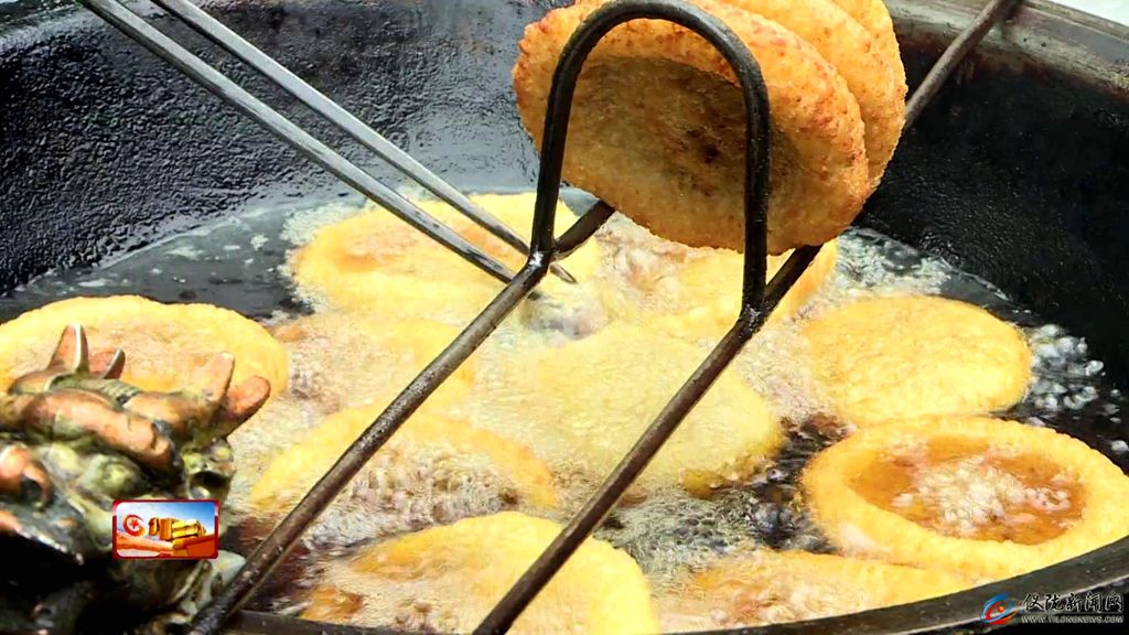 据老板罗海全介绍,油干的外皮是用纯糯米做成的,内馅则是用本地的绿豆做成的。做好的油干放进锅里炸至金黄,闻着特别的香。