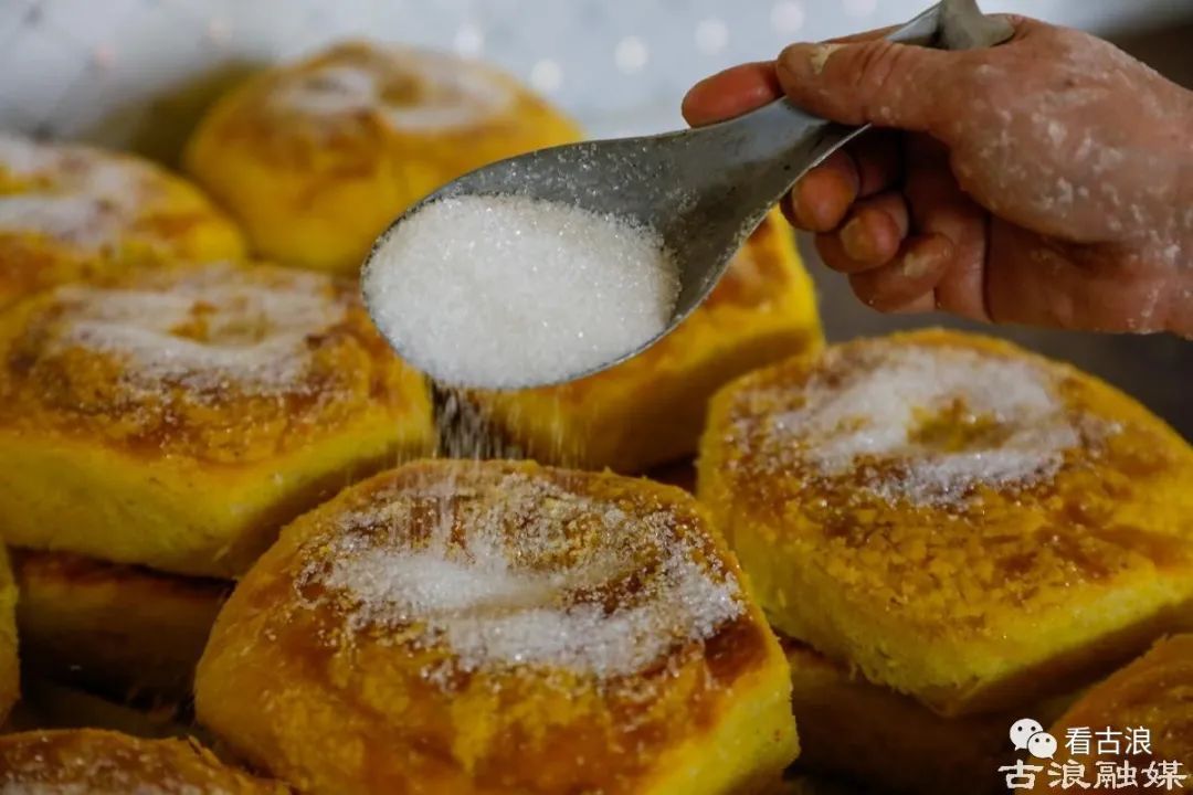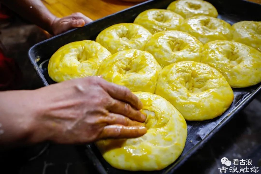 花椒水和面,撽入鸡蛋、菜籽油,纯手工发面揉的酥软,一边擀张张,一边将油姜黄层层打入卷起来,用手按压团成一个圆圆的饼,中间部分用五指压出一个小圆圈,这样防止烘烤时起泡。入炉前面饼上再次打入特制的油姜黄,然后放进电烤箱烧制,约十多分钟后饼子便烤熟了。抽出铁板在酥饼中心凹陷处撒上白砂糖,更是锦上添花、增色增香,金黄金黄的颜色,圆圆的形状很是喜庆如意。出锅后需放置一昼夜让蛋面油糖渗透相融,这样饼子更是纯真香甜,酥软味美。