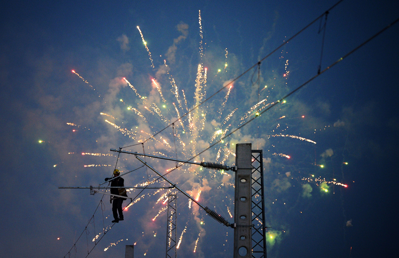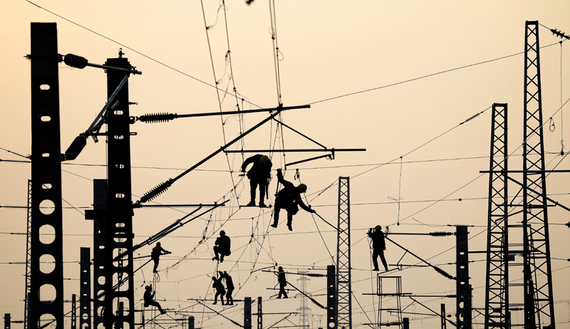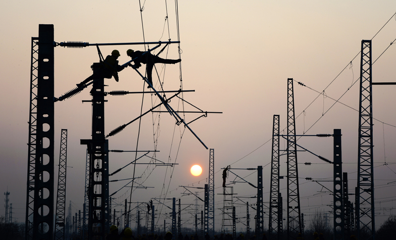 1月7日,中铁七局的铁路建设者在进行铁路线路接触网施工。