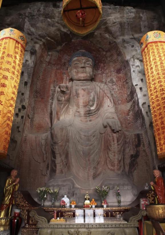 据现存碑记记载,大佛凿于唐代开元至元和年间(公元713—820年),通高9.88米,为弥勒佛坐像。佛身后尚有10厘米高的小佛三千余尊,镌工精湛。