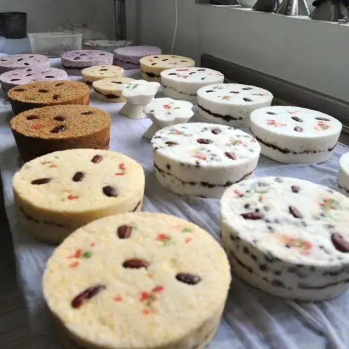 但是两种米的浸泡时间不同、配比不同,研磨的颗粒粗细不同、制作工艺不同,上笼蒸米的时间不同……形成了各种不同的糕团。