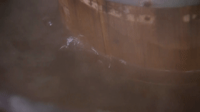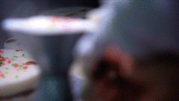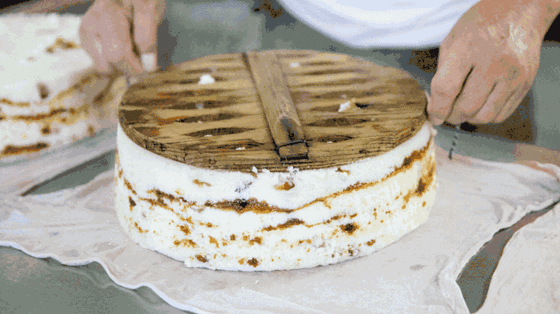 大约半个小时,一块热气腾腾、白白嫩嫩的桶蒸糕就新鲜出炉了。最后洒一点糖水,使整块糕更光滑,看上去也更好看。