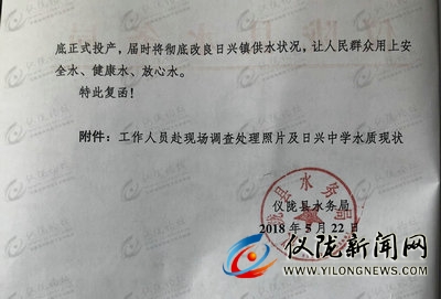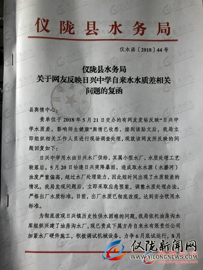 帖文发出后,5月 22日,县水务局作出回应。就网友反映的问题进行了现场调查处理并在网上回复网友。“日兴中学用水由日兴水厂供给,其属小型水厂,水质处理工艺较落后。5月20日恰逢日兴突降暴雨,造成取水水源(水磨河)浊度严重偏高,超过水厂处理能力,因此短时间出现了水质较差的情况,我局发现问题后,立即采取紧急预案,调整水质处理办法,严格出厂水质标准。目前,出厂水质已彻底改观,达到安全饮用水标准。为彻底改观日兴镇历史性供水困难,我局依托油房沟水库组织兴建了油房沟水厂,现已责成下属方舟自来水有限责任公司加紧水厂硬件施工,积极调试机械设备,力争6月底试运行,8月底正式投产。届时将彻底改良日兴镇供水状况,让人民群众用上安全水、健康水、放心水。”(编辑/范红英)