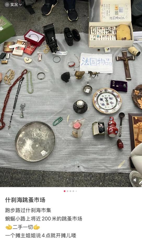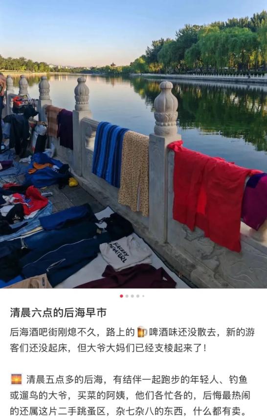 “周末凌晨,什刹海的夜生活还刚落幕,睡不着觉的老北京们,就开始支棱起限定派对——把自个家的闲置物件拿出来摆摊,杂七杂八的什么都买,几块钱的的确良衬衫、老式自行车、过期三明治、卤味……甚至还有大爷讲故事,比潘家园的东西还野,年轻人说是来逛街,80%是来围观老北京精神状态的。”