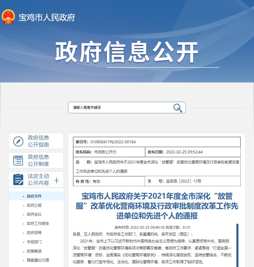 2月25日,宝鸡市人民政府官网发布了关于2021年度全市深化“放管服”改革优化营商环境及行政审批制度改革工作先进单位和先进个人的通报。