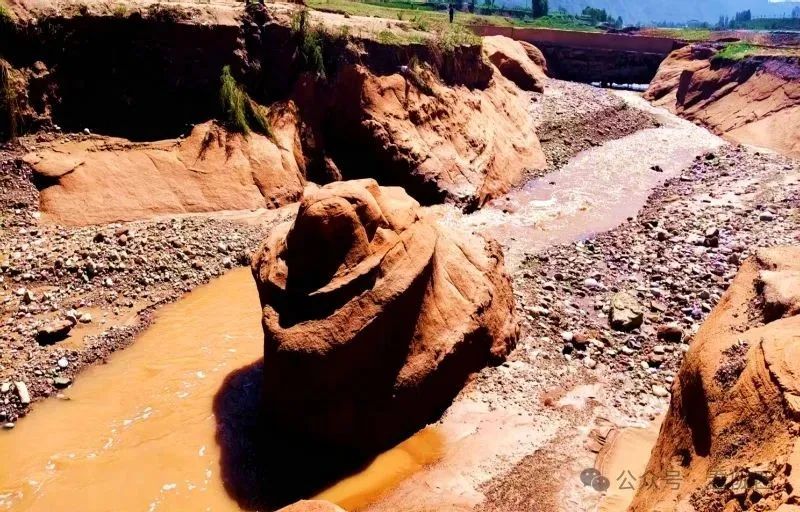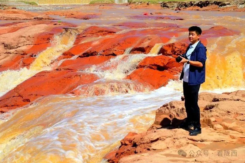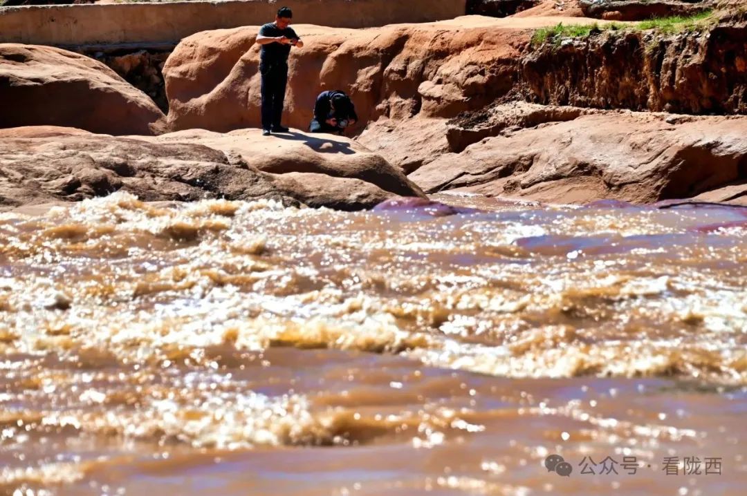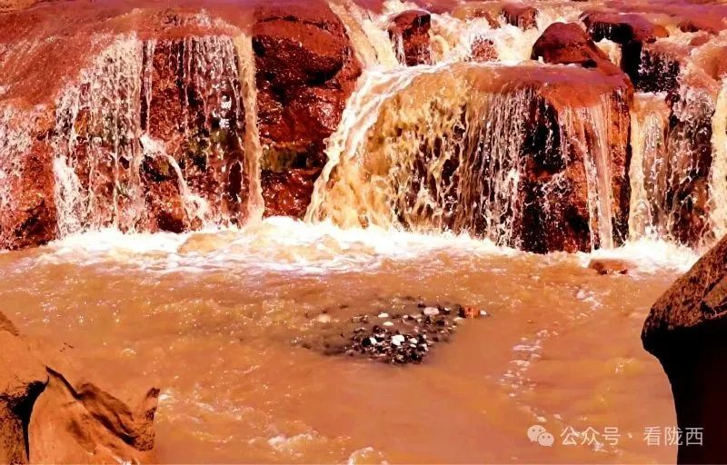 夏日的渭河河那坡段,红色砂岩在流水的雕琢下形成了层叠的滩涂,河水奔腾而下,溅起朵朵白色浪花。这幅既显雄浑又富斑斓的独特景观,吸引了众多市民前来游玩、打卡。